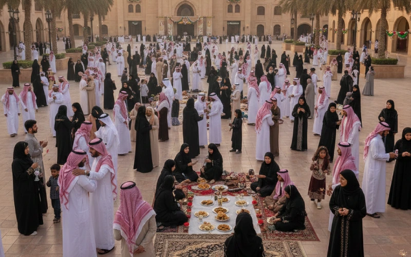 - Traditional feasts featuring dishes like lamb kabsa, dates, and sweets like maamoul.
